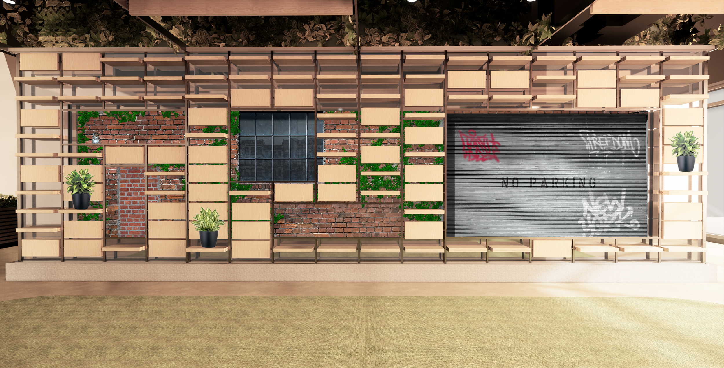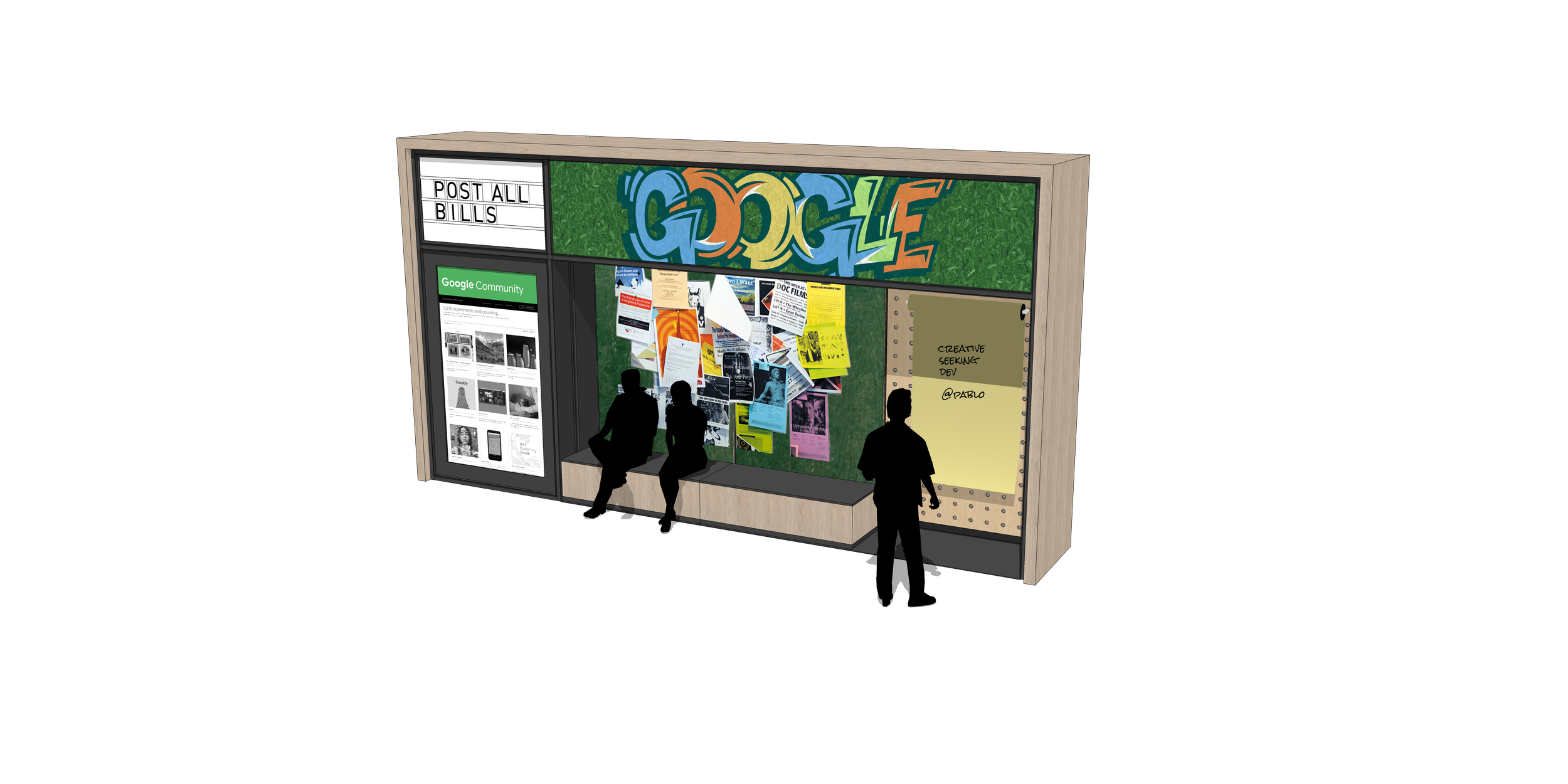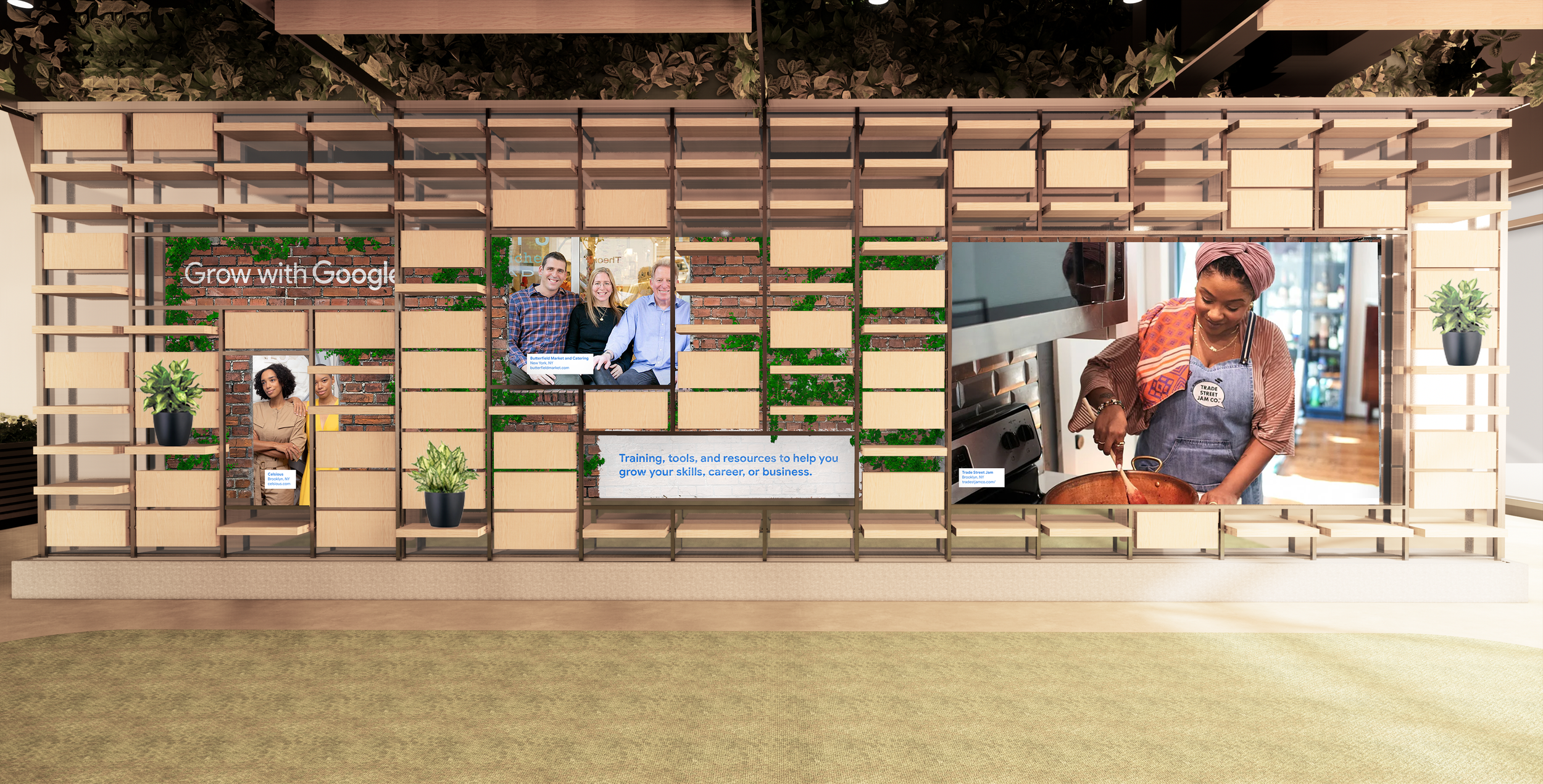 One project I worked on was called Community Garden which was a large interactive display with a trellis system that framed specific parts of the screen. The screen was meant to make it feel like you were on a New York street, looking at brick, and the framed section could have different information such as businesses that were sponsored by Google, or parts of a mural. I designed the assets for the well working with architectural renderings.