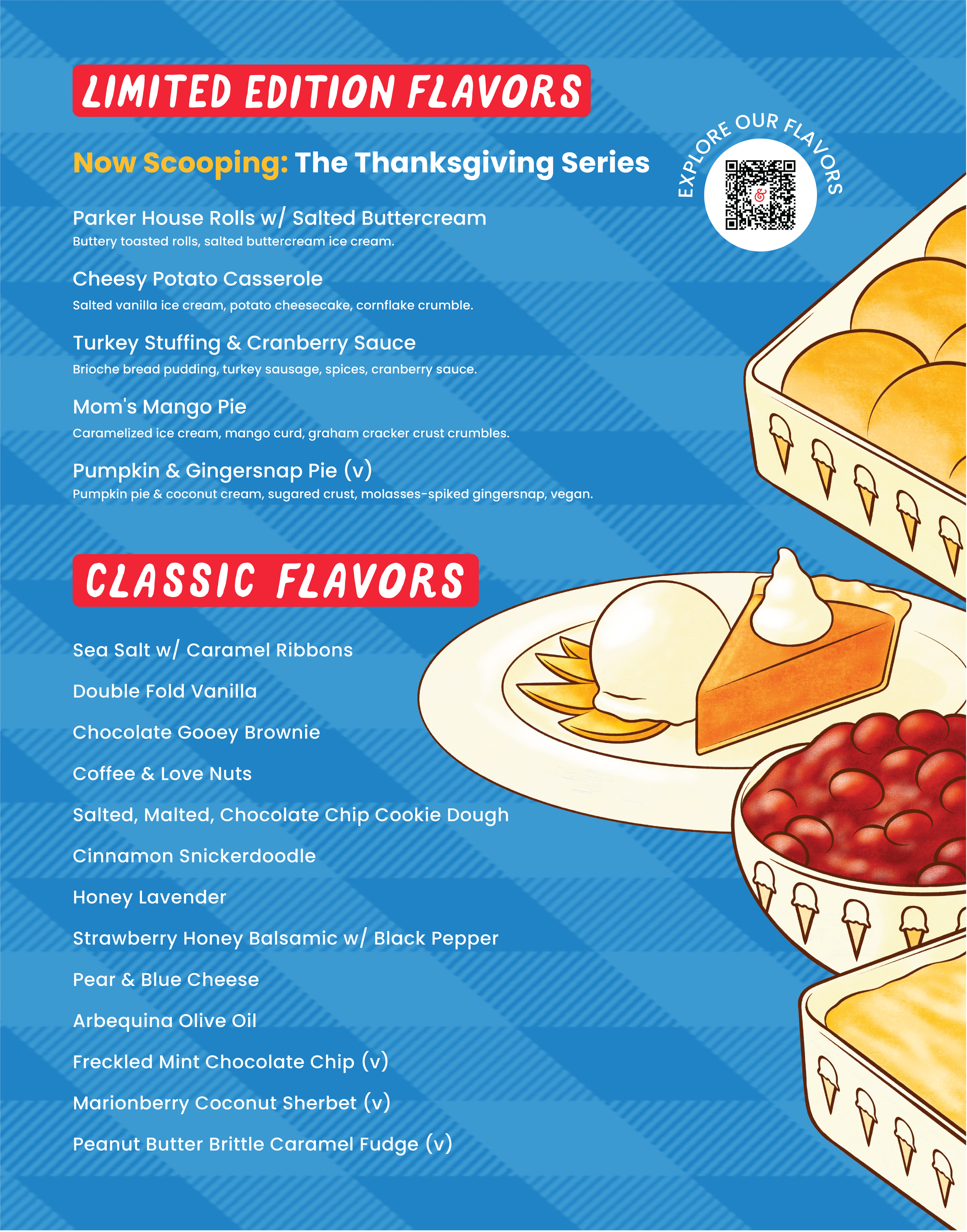 The client decided on this table scene with five Thanksgiving dishes, connected to the flavors featured in the ice cream this month, placed on a table pointing to a gathering for a feast.